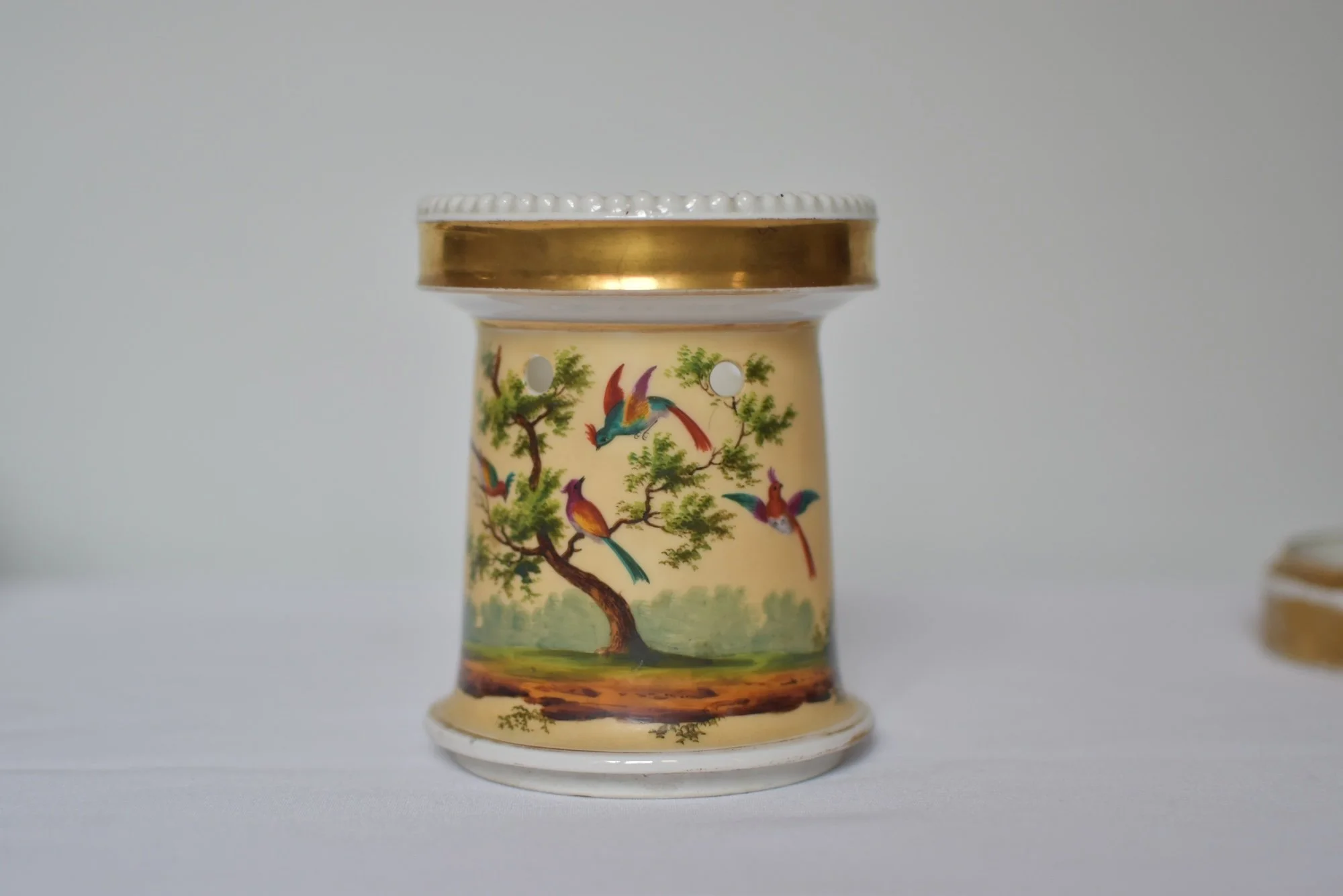 This veilleuse was owned by Eugenie Dubuys, who married Samuel Hermann Jr. in 1835. She likely used it at her bedside at 173 Customhouse Street where the couple moved after marriage⁵. Dubuys’ veilleuse is an example of Old Paris porcelain, which was popular among New Orleans French Creoles and other European-descended elites.