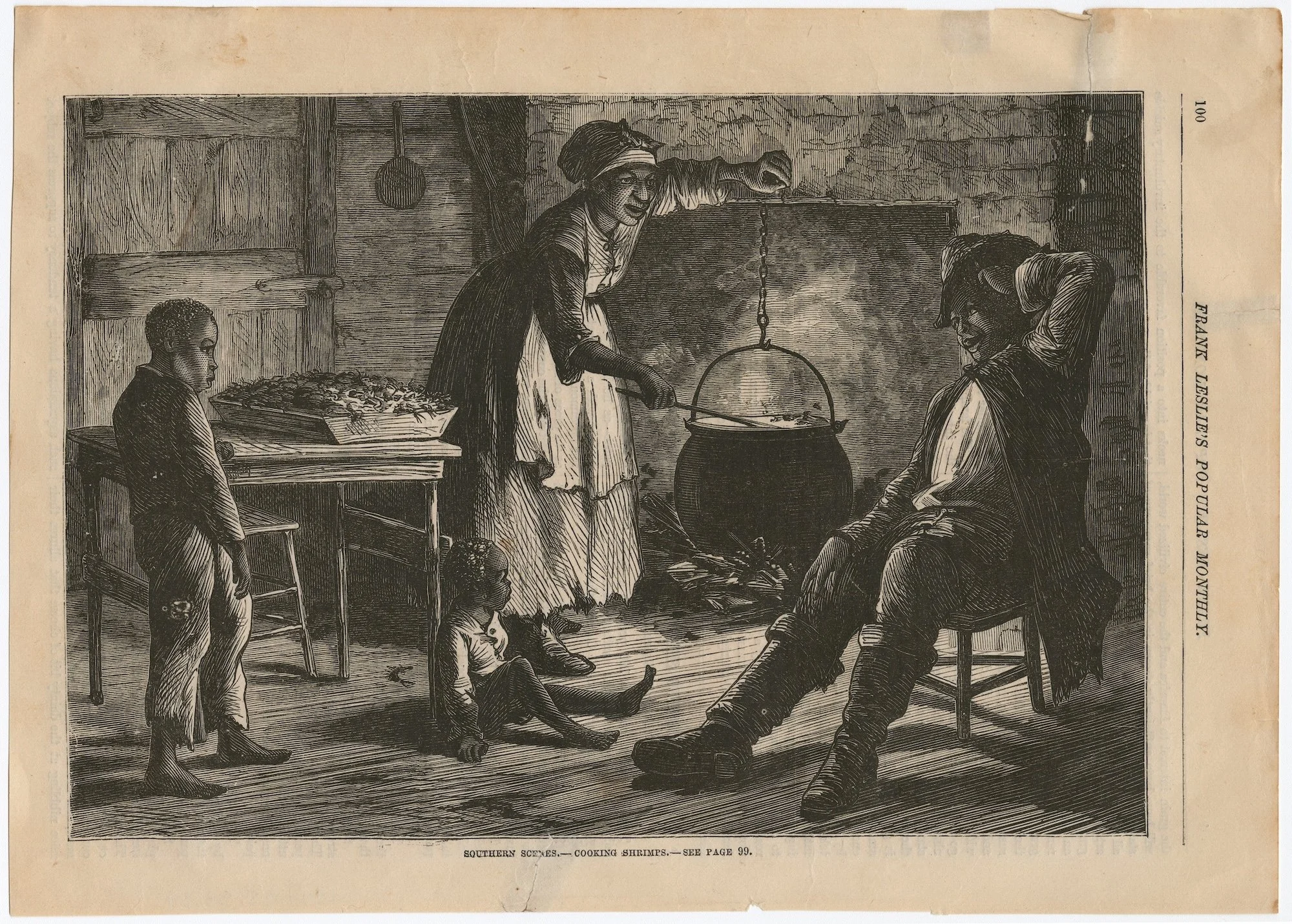 [Figure 3. This 1877 engraving shows a Black family in what seems to be their personal kitchen, with the woman stirring a large pot in a hearth. Although it was created later than the objects in the Hermann-Grima House, this illustration shows one possible way the open-hearth kitchen could have been used, and the title gives an idea of what might have been cooked. Historic New Orleans Collection, 1974.25.23.39.]