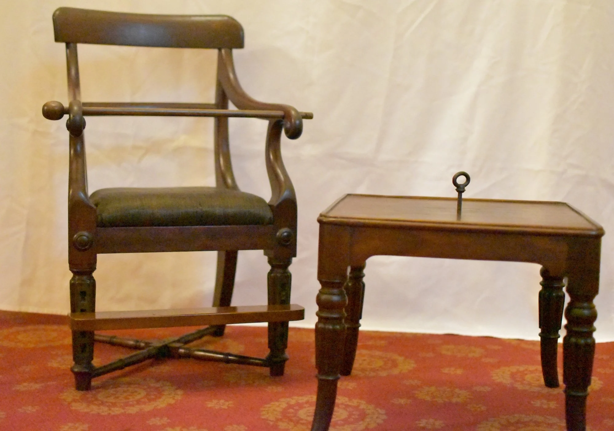 Although the steps made life for the homeowners more convenient, the enslaved workers had the unpleasant job of emptying and cleaning the chamber pot inside. This work was sometimes done by enslaved children. If this set of bed steps was used in the main bedroom of the Hermann-Grima House, which is on the second floor, a good deal of labor was involved: someone had to bring the chamber pot up and down the steep service stairs, deposit the waste into a pit outside or set it aside for use as garden fertilizer, clean the pot (likely with water gathered from the cistern), and replace it in the room to be reused.