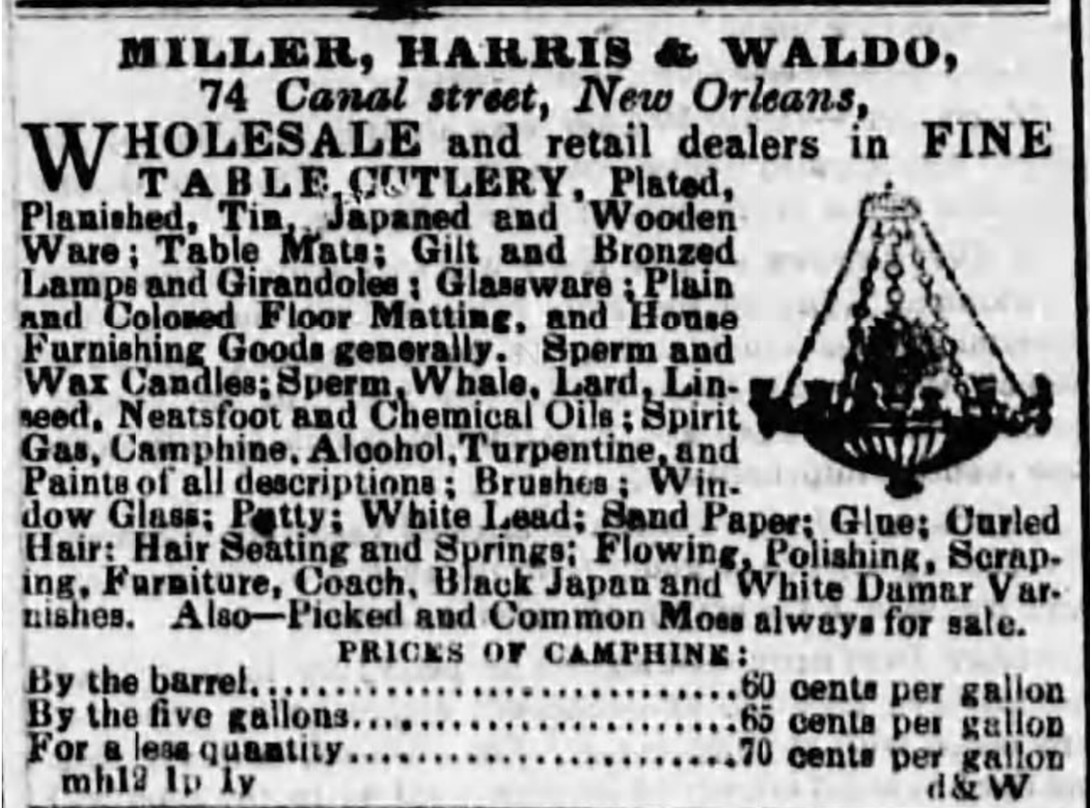 [Figure 10. Advertisement for Miller, Harris & Waldo for various household furnishings, including girandoles and candles of various materials in The New Orleans Crescent from Tuesday, November 18, 1851.]
