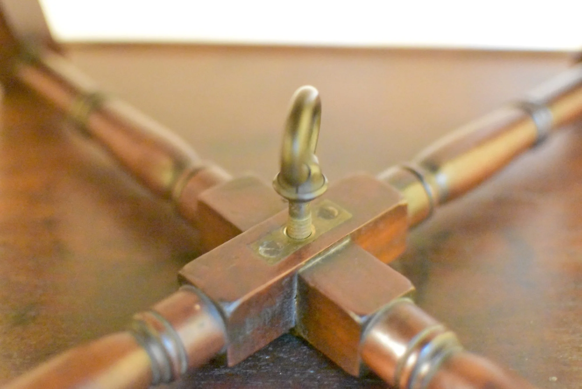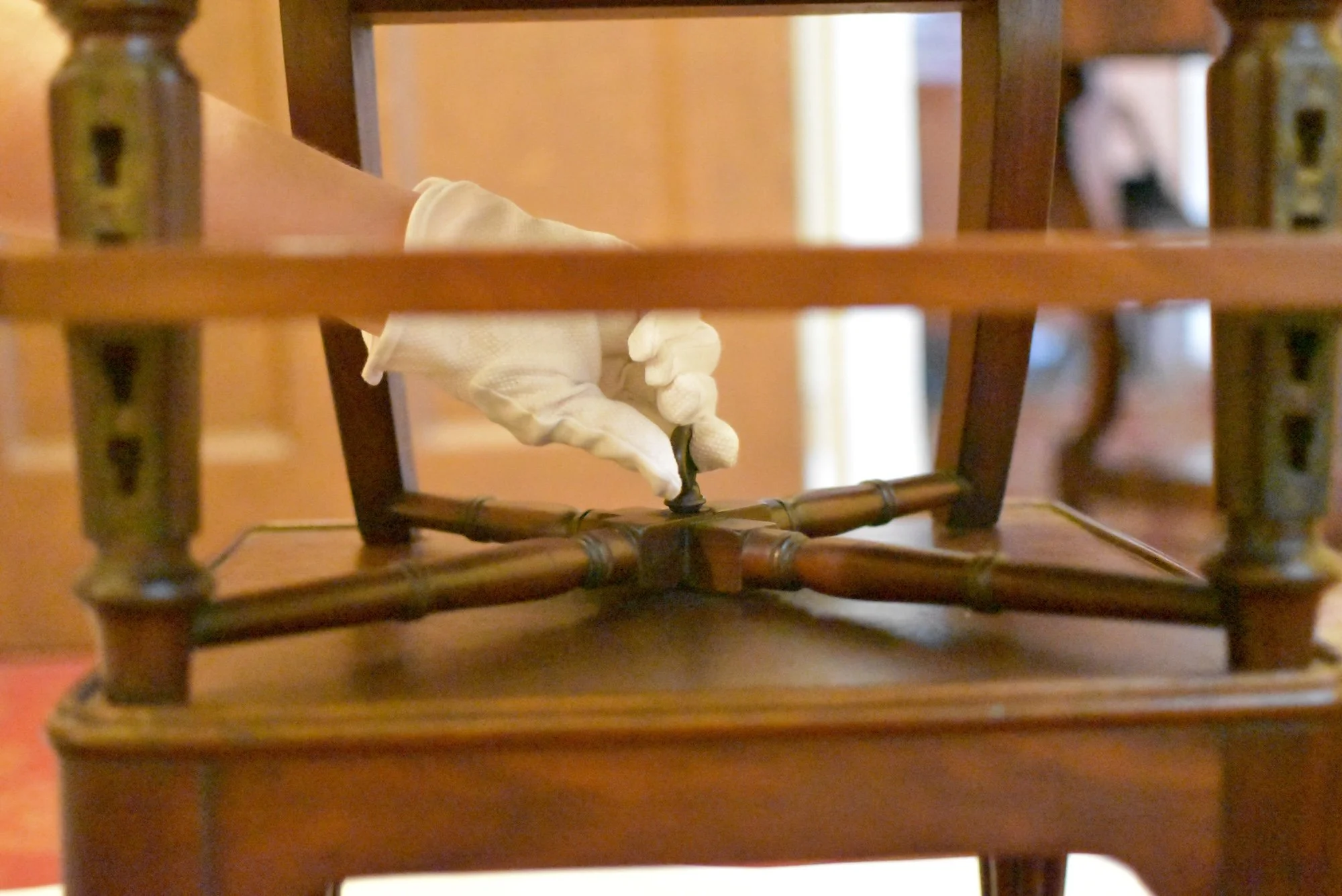 A brass screw connects the x-shaped stretcher supporting the chair to another element, which, when separated, serves as a small table to be used with the (now shorter) chair. Like the specialized knowledge of enslaved waiters serving an elaborate meal, an awareness of the mechanisms of this convertible chair was required for its use by an enslaved person. Each instance of its use—especially before one was familiar—could be another source of anxiety for a laborer and damaging it could result in punishment.
