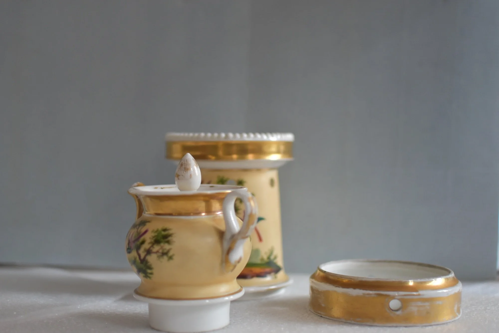 [Figure 27. Veilleuse separated into component parts to display how the appliance was used. The tall cylindrical piece would sit around a tea candle that fits into the short, round base. The small teapot would then be placed atop the cylinder to keep the contents warm.]