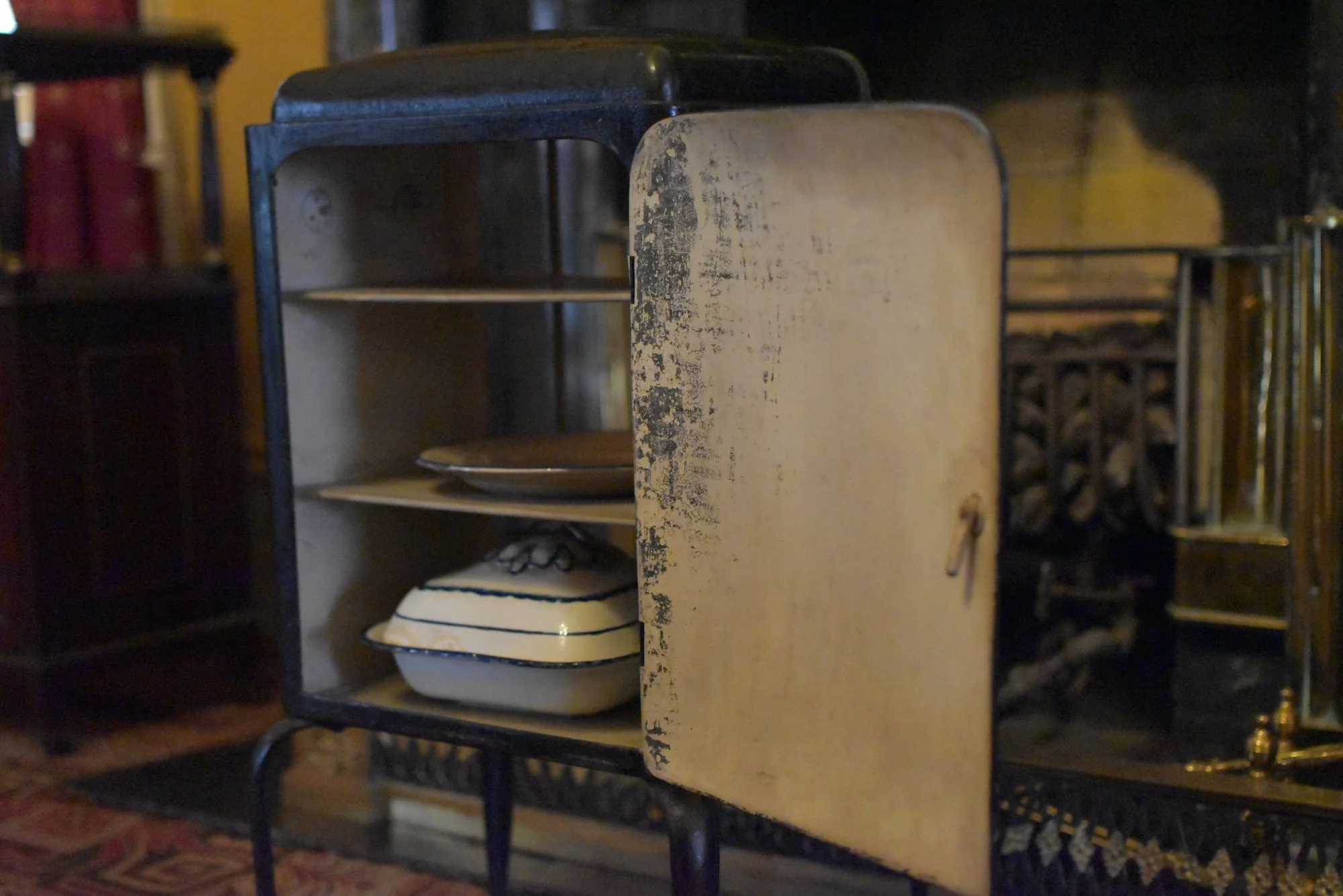 Placing this appliance close to a fire brought the temperature high enough that it was essentially a small oven. Enslaved individuals placed porcelain plates (hard enough to withstand extreme heat) onto the internal shelves to keep them warm, so that the white hosts and their guests would be served food at the optimal temperature. While those at the table probably took this luxury for granted, the enslaved individuals would have to face burning temperatures at every meal. The many courses served meant multiple rounds of plates would need warming. The enslaved individuals would have to serve the food on time, clear the table between courses, and sometimes travel between the outside kitchen and the pantry to plate the food, all while risking their own physical safety in close proximity to open flames and expensive, breakable furnishings.