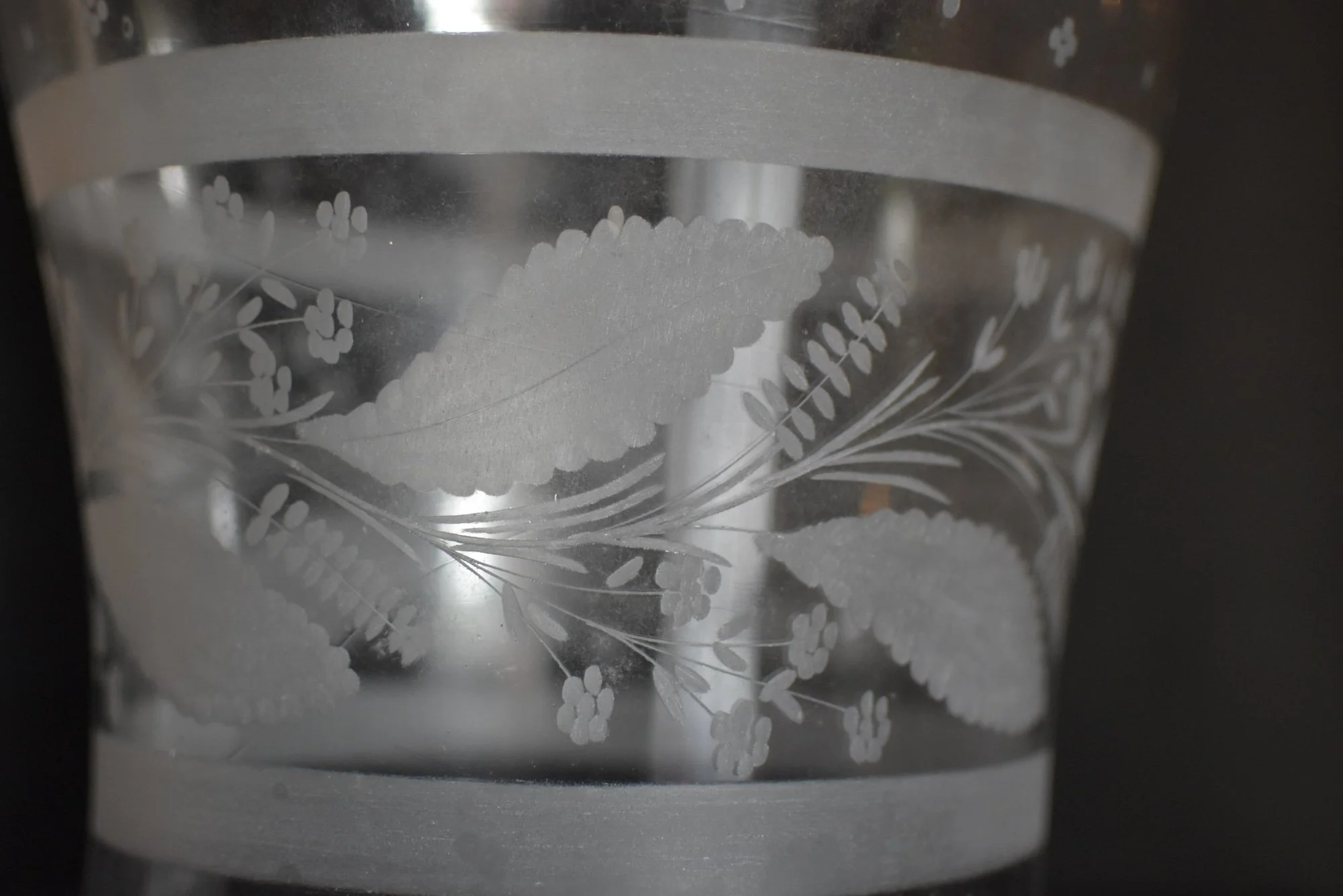 This pair of delicately engraved glass hurricane shades, sometimes called “smoke shades” or “hurricane glasses”, were placed over candles and candlesticks on the table to protect the flame from being extinguished and sleeves, napkins, or tablecloths from getting burned⁴. Over time, smoke from the lit candles beneath would collect on the inside surface of the glass, which would require regular cleaning.