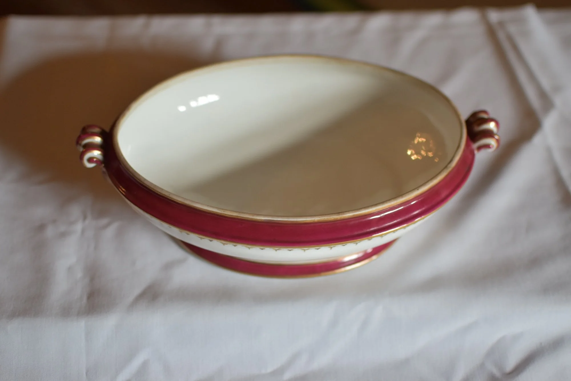 French culture was a dominant influence in 19th-century New Orleans, particularly in home and dining etiquettes. For meals in the dining room, enslaved domestic servants had to have special knowledge of the French manner of service. This Vieux Paris (“Old Paris”) dinner service dates to between 1840 and 1850. Old Paris porcelain, produced in small Paris factories, gained prominence among New Orleans buyers in the early 19th¹. Available in a variety of styles, shapes, and rich colors, it featured a solid color ground under painted decoration. This set includes several types of plates, a soup tureen, a fish platter, and soup bowls all decorated with a deep maroon border with gold accents. The large number of pieces in this set alludes to the popularity of the French dining style as well as the purchaser’s level of wealth because proper use of the array of pieces reflected the owners’ knowledge of property dining etiquette.