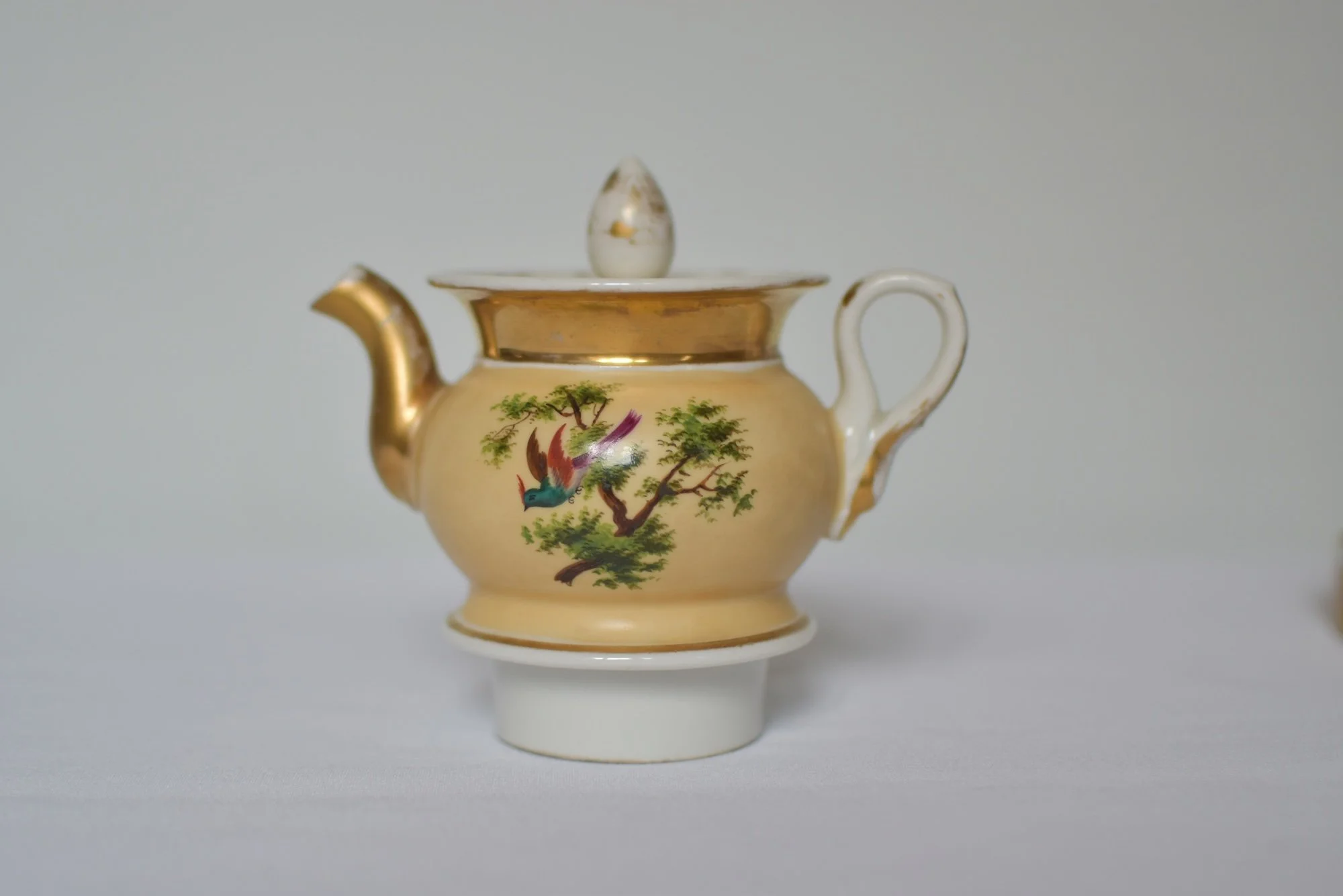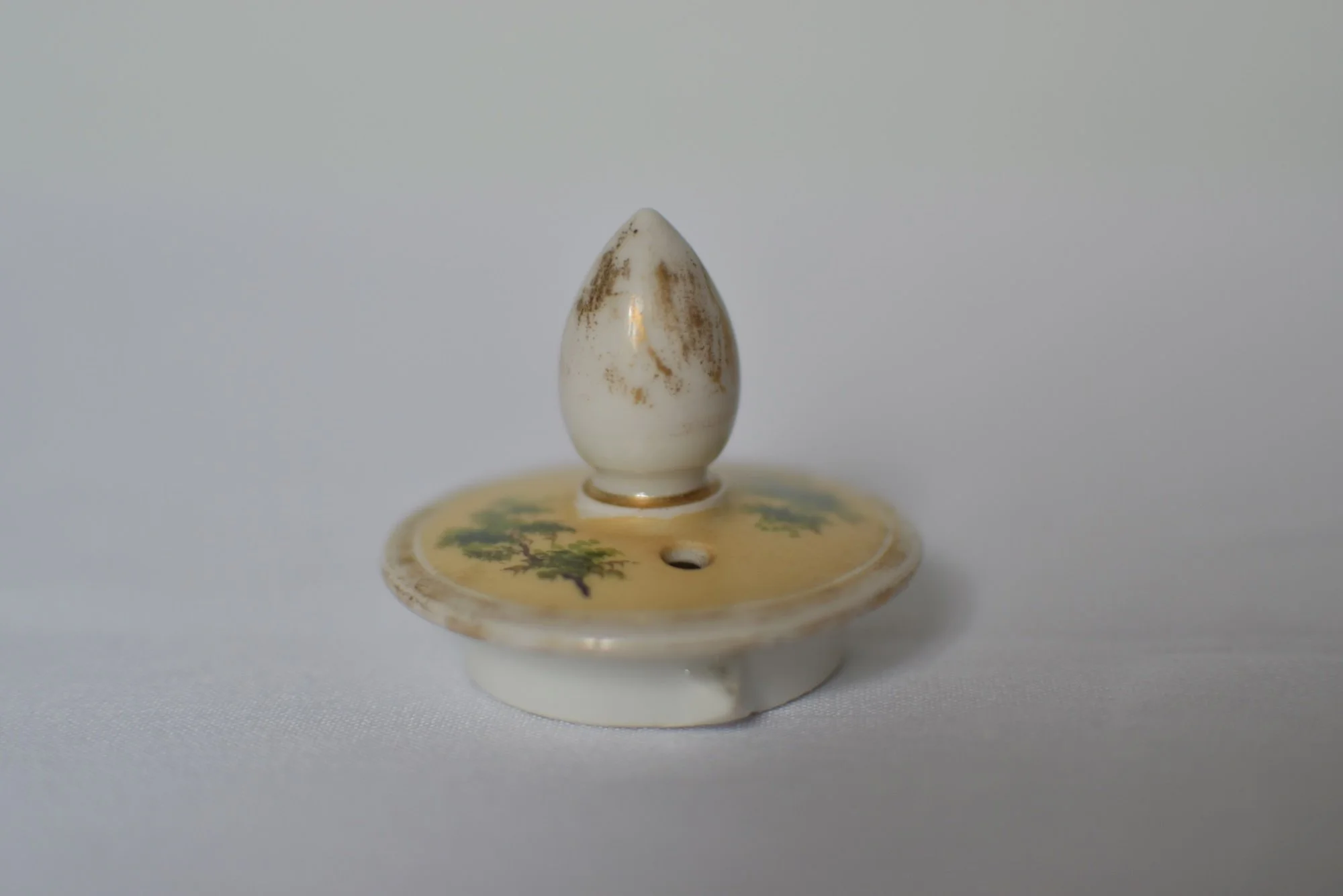This small object would have held tea or medicine in the top teapot and a small candle in the cylinder at the bottom to keep the liquid warm. It is called a veilleuse, which means “night light”, or tisannière which refers to the tisane, or tea, that would be held in it. The dim light from the candle would also have provided enough visibility for minor activities people might have had to do at night without having to light a larger candlestick.