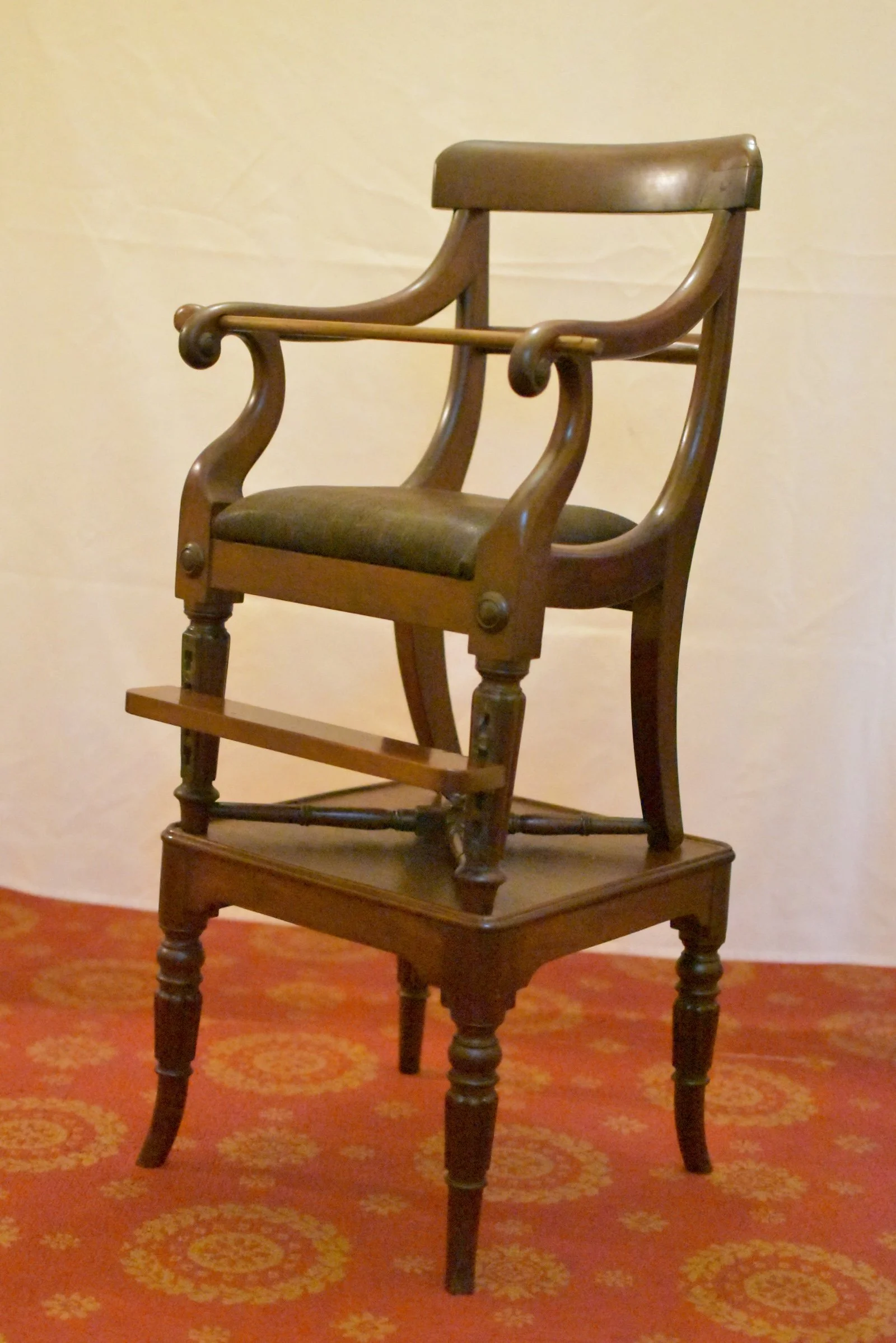 This child-sized highchair is made of mahogany, one of the most prized woods in nineteenth-century Louisiana for its high shine, naturally appealing grain pattern, and durability. The wood was native to South Africa and mainly cultivated in the West Indies on mahogany plantations.