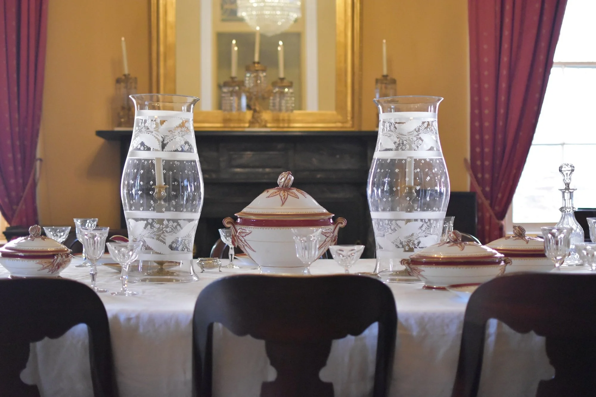 [Figure 16. Hermann-Grima House dining table with hurricane shades positioned as they would have been during a meal, over candlesticks.]