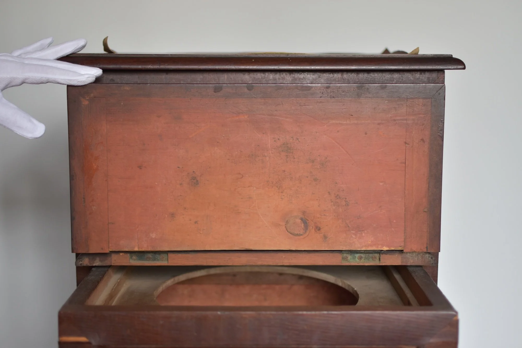The main function of bed steps was to help 19th century people get into raised beds. However, Hermann-Grima House’s example served another hidden purpose: the middle step also opens to reveal a large circular hole that would have held a chamber pot. It could also have been used for someone with health or mobility issues, especially in old age, as having a commode so close to the bed would have made relieving oneself faster and easier. The top step also conceals a small compartment that could be used for storage, perhaps for a cloth for users to dry themselves after cleaning up in the wash basin after using the chamber pot.