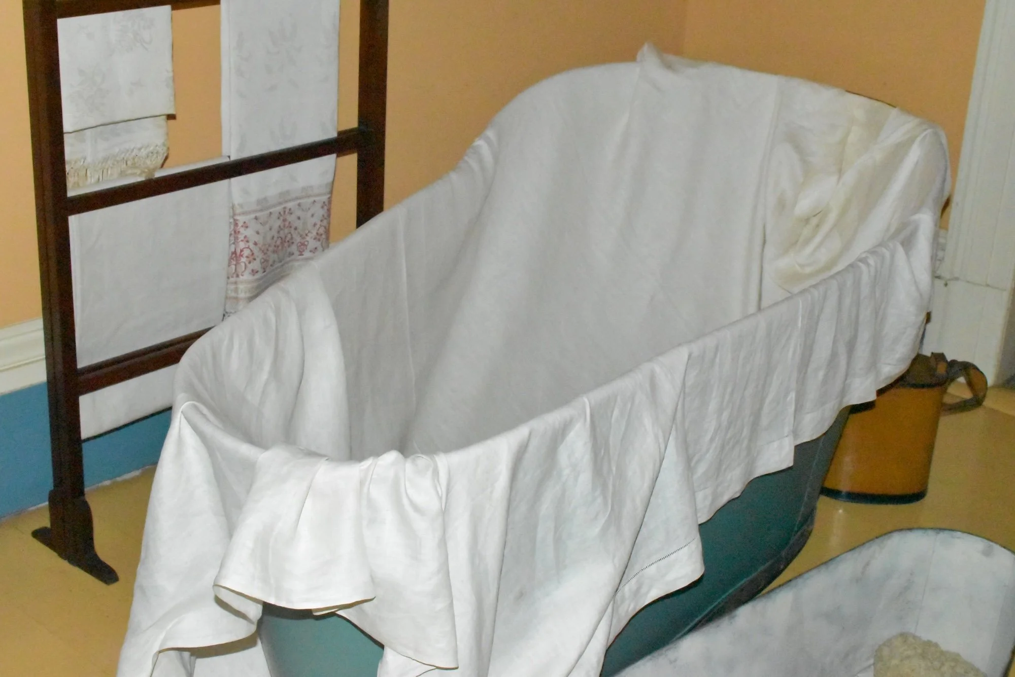 [Figure 24. Bathtub in the bathroom behind the children’s room in the Hermann-Grima House. A cloth may have been draped over the inside as seen here to make sitting on the metal more comfortable.]