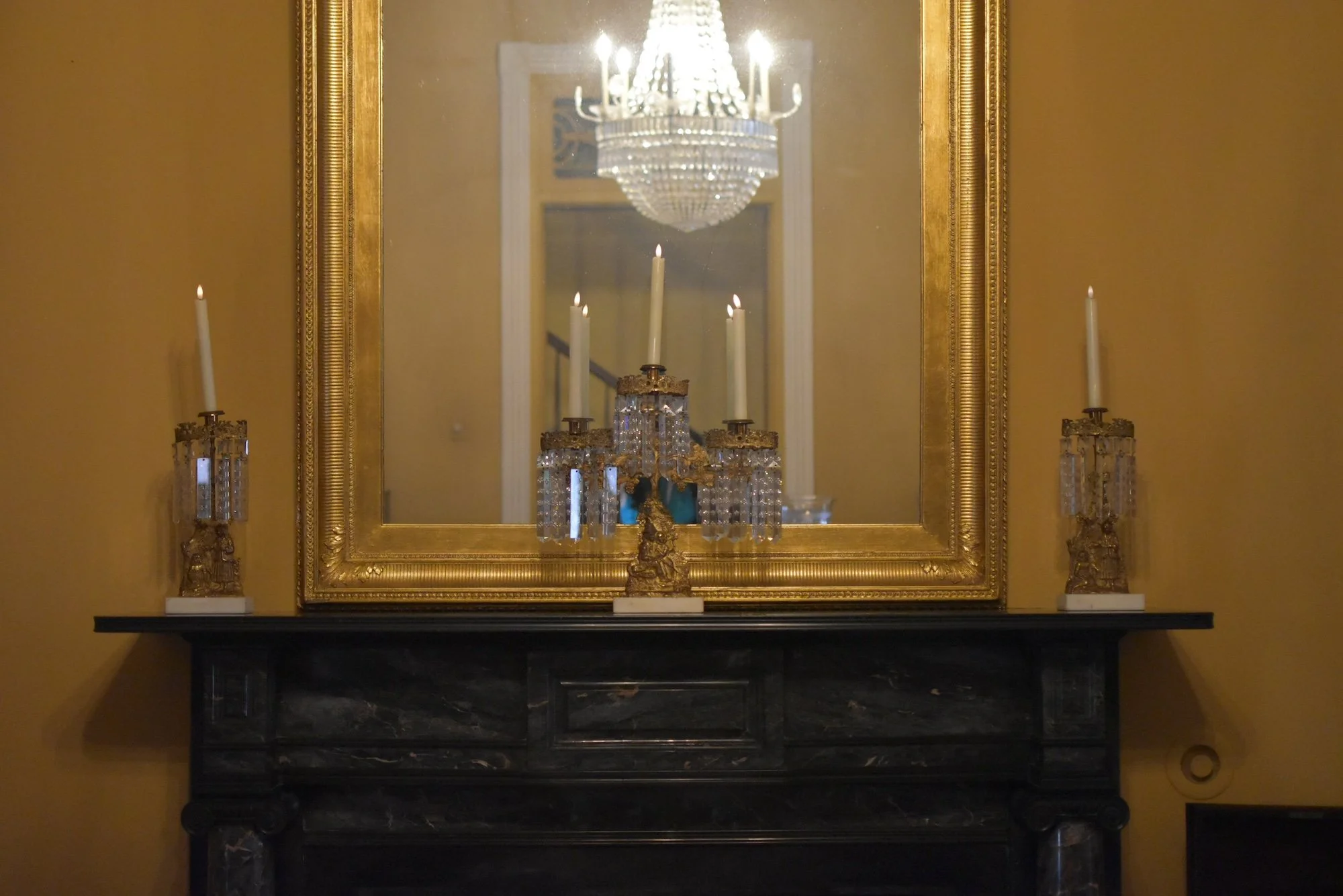 The delicately connected prisms made cleaning complicated since they often fell off and were expensive to replace. This would have made the job of cleaning the mantle extra tedious for enslaved domestic servants. Not only did they risk breaking the girandoles or scratching the crystal if they used the wrong cleaning material on it, but they also risked ridicule and punishment for any mistakes they made during the process.