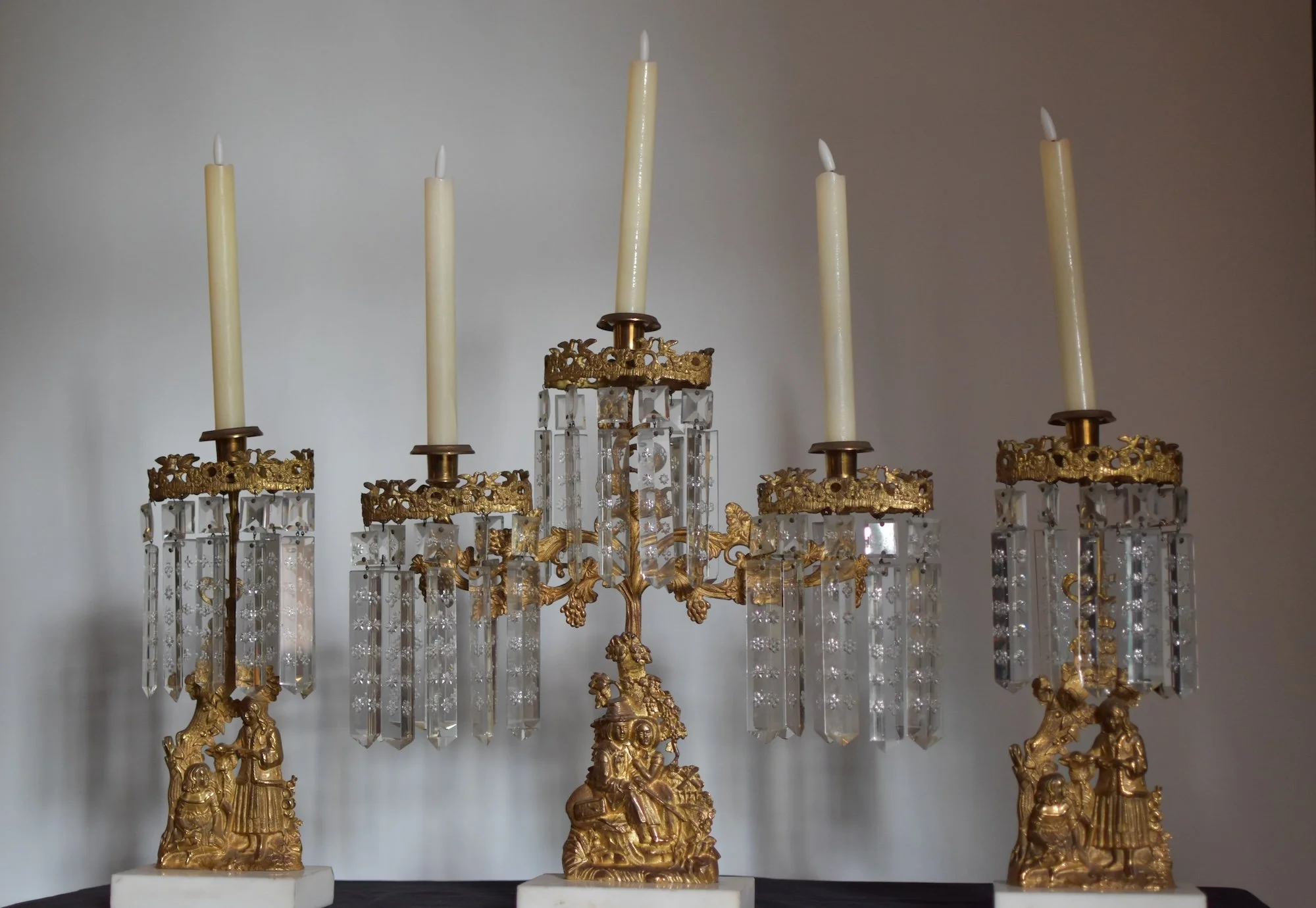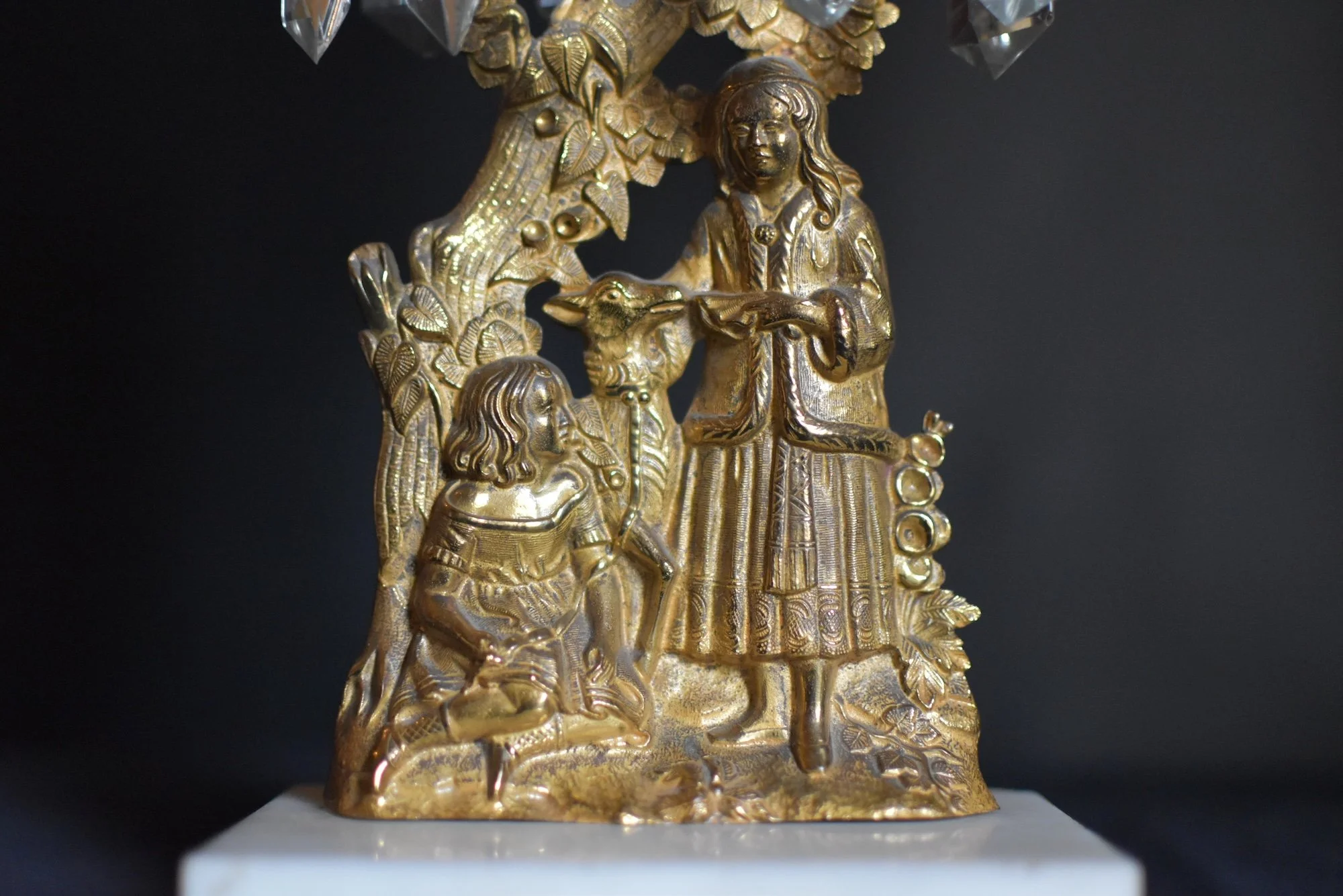Figural girandoles such as these were a uniquely American decorative object, originating in their common form around the 1840s³. Girandoles were pricier than plain tin candlesticks, making them a status symbol for those who could afford them, but they still cost less than bigger fixtures such as lamps, so they became accessible to middle-class laborers if they saved up a few weeks’ pay. The heavy marble base and sparkling crystal prisms added to the luxurious appearance, and girandoles came to be used primarily as mantle decoration rather than functional fixtures.
