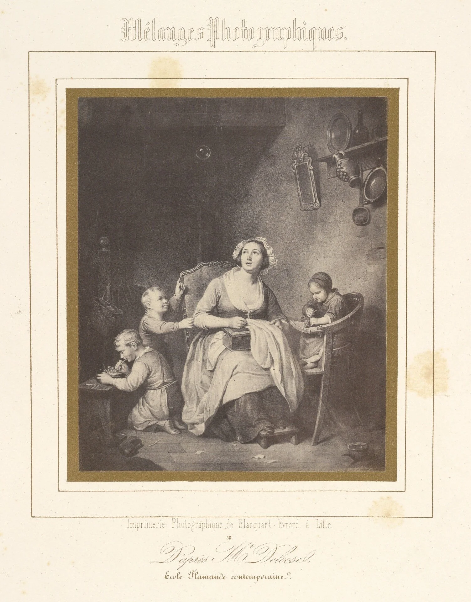 [Figure 21. An engraving of a painting by Basile de Loose titled 'Family in an Interior,’ featuring a woman sewing with three children around her. The child on the right is seated in a highchair similar to the Hermann-Grima House example. Courtesy of The Getty Museum.]